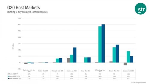 近日G20峰會(huì)在德國(guó)漢堡舉辦,截至7月8日,STR分析了前八個(gè)主要酒店市場(chǎng)的七天平均值。為了反映漢堡的潛在結(jié)果,分析排除了三個(gè)市場(chǎng)(法國(guó)戛納,墨西哥Los Cabos和土耳其Serik),以維持大型酒店市場(chǎng)的基準(zhǔn)重點(diǎn)。七天滾動(dòng)平均法計(jì)算了5天內(nèi)每個(gè)事件所產(chǎn)生的酒店業(yè)務(wù)以及為期兩天的活動(dòng)本身。