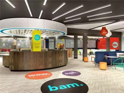 2016年年初,希爾頓酒店集團也曾宣布將推出一個針對預算緊張的年輕客戶的中端品牌Tru,每晚價格在90-100美元。據(jù)希爾頓首席執(zhí)行官Christopher Nassetta介紹,Tru品牌的酒店前臺配備社交媒體墻面播放實時內容,促進大堂內客人間的互動;游戲區(qū)配備桌游、與衛(wèi)星服務相連接的大屏幕和具有體育場創(chuàng)意的座椅;所有房間都配備55英寸電視、免費的高速Wi-Fi,智能手機可作為房間鑰匙進行移動簽入。