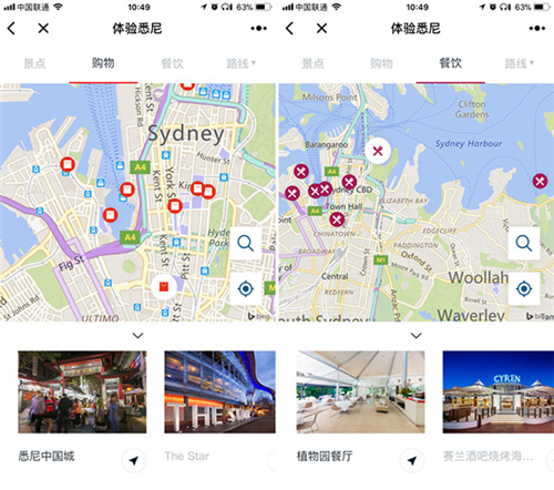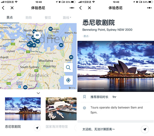 去悉尼旅游時,到達目的地之后,只要用微信打開“體驗悉尼”,小程序就會根據(jù)你的地理位置為你推薦附近的旅游景點。