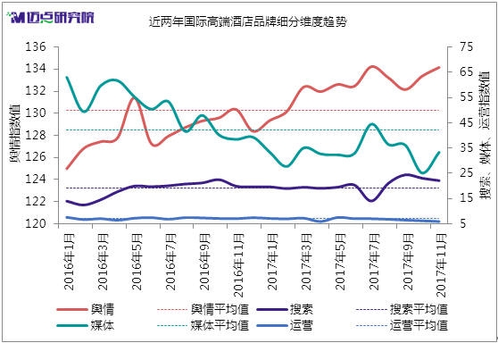 從近兩年國際高端酒店品牌影響力的四個(gè)維度表現(xiàn)來看,其輿情指數(shù)與媒體指數(shù)形成了巨大反差。一流的硬件配套設(shè)施與多樣化的服務(wù),為國際高端酒店品牌在國內(nèi)市場中贏得了消費(fèi)者的廣泛好評,輿情指數(shù)不斷攀升。然而,由于發(fā)展時(shí)間較長,市場成熟度高,目前媒體對于這一細(xì)分市場的關(guān)注度正在逐步下滑。此外,對于國際高端酒店品牌而言,運(yùn)營指數(shù)還有待提高。