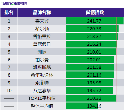 輿情指數(shù)上,本月共有8家酒店品牌的指數(shù)值突破200,而國際高端酒店品牌的整體輿情指數(shù)也達(dá)到了134.16,可見市場對于國際高端酒店的認(rèn)可度相對較高。TOP10品牌中,喜來登依然處于領(lǐng)先優(yōu)勢。