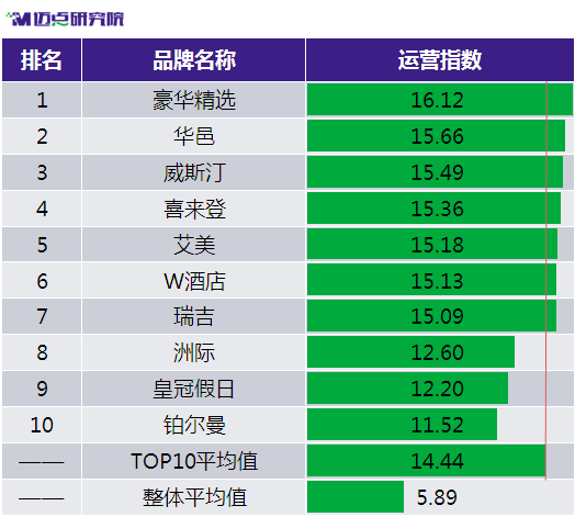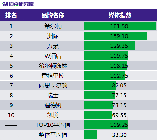 2017年11月,根據(jù)邁點(diǎn)研究院(MTA)對國際高端酒店品牌品牌指數(shù)的不完全統(tǒng)計(jì),本月國際高端酒店品牌風(fēng)云榜TOP10依次是希爾頓、洲際、香格里拉、喜來登、萬豪、皇冠假日、希爾頓逸林、四季、威斯汀、W酒店。