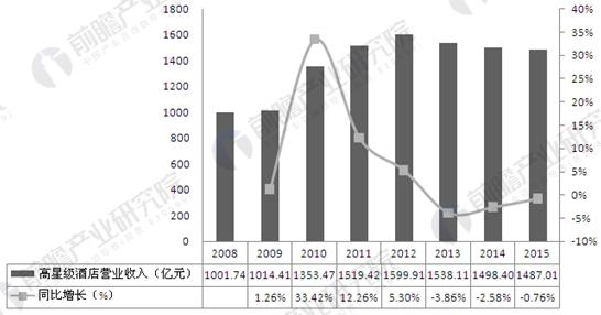 2008-2015年中國(guó)高星級(jí)酒店市場(chǎng)營(yíng)業(yè)收入情況(單位:億元,%)