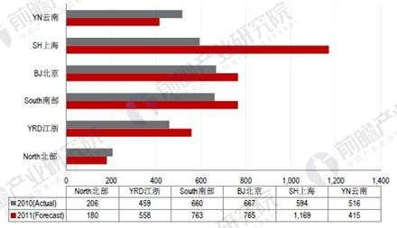 在客房收入方面,2011年,我國(guó)南部地區(qū)精品酒店每間可出租客房收入為763元,較上年有所增加;而北方地區(qū)為180元,較上年有所下降。從重點(diǎn)城市來(lái)看,2011年上海精品酒店每間可出租客房收入最高,為1169元;其次是北京,為765元;浙江精品酒店每間可出租客房收入為558元;云南精品酒店每間可出租客房收入