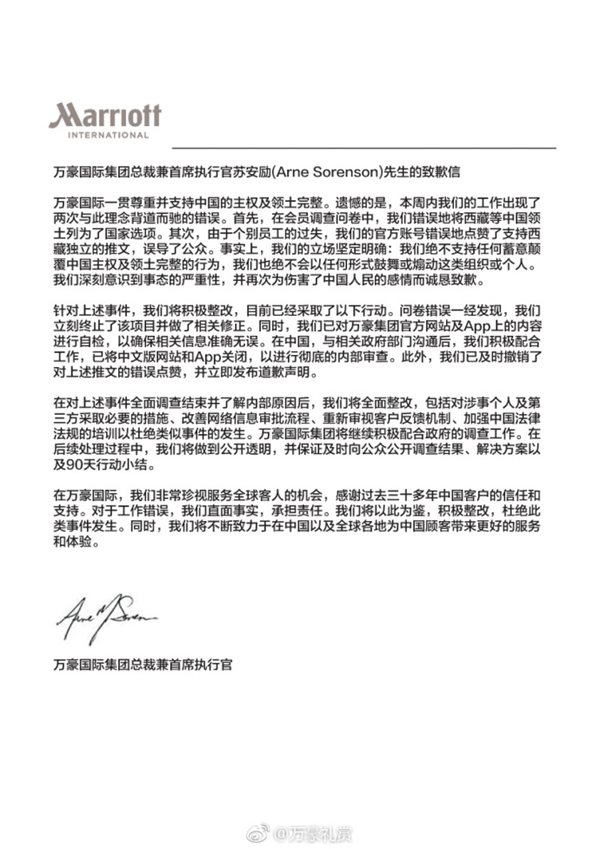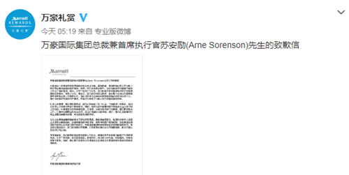 1月12日凌晨,萬豪國際集團微博賬號“萬豪禮賞”發(fā)布該集團總裁兼CEO蘇安勵的致歉信。致歉信中稱,“由于個別員工的過失,我們的官方賬號錯誤地點贊了支持‘西藏獨立’的推文,誤導了公眾?!?/p>