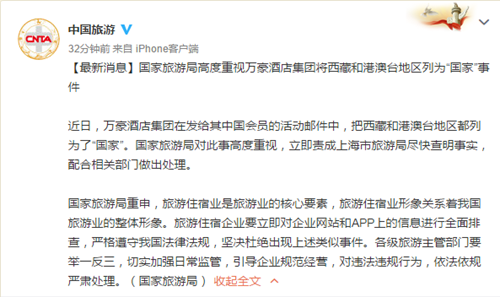 據(jù)國家旅游局官方微博11日通報,國家旅游局高度重視萬豪國際集團將西藏和港澳臺地區(qū)列為“國家”事件。