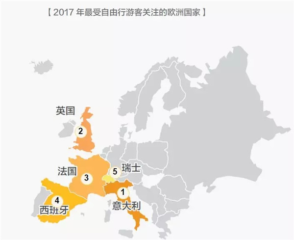2017年最受自由行游客青睞的歐洲旅游目的地分別是意大利、英國、法國、西班牙和瑞士。其中,由于意大利、法國和瑞士相近,多自由行游客會在規(guī)劃行程時選擇“法意瑞”游玩路線,在15天左右的時間里玩轉三個國家。