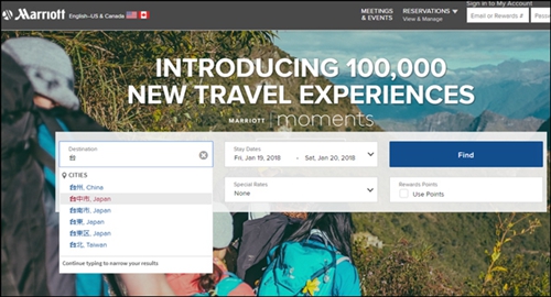 新聞來源:宏輝智通 發(fā)布日期:2018-01-20 瀏覽次數(shù):3067在萬豪英文版網(wǎng)站頁面輸入“臺”字,下拉菜單中出現(xiàn)中國臺灣的“臺中市”、“臺南市”和“臺東(縣)”,竟然都被標明所屬于日本。