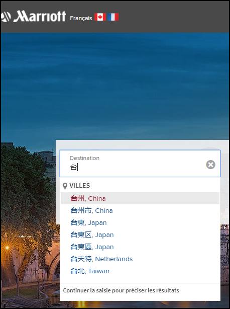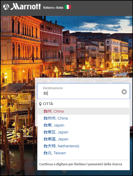 登陸萬豪法文版、意大利文版查詢,沒有出現(xiàn)臺中、臺南,但臺東仍顯示為屬于日本,推薦的是東京的酒店。