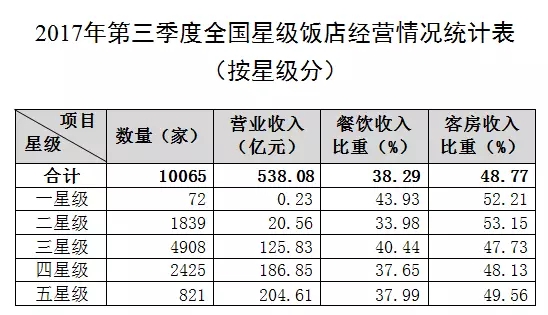 全國10065家星級飯店第三季度的營業(yè)收入合計538.08億元,其中餐飲收入為206.03億元,占營業(yè)收入的38.29%;客房收入為262.42億元,占營業(yè)收入的48.77%。