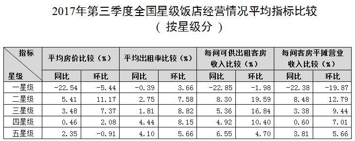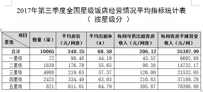 全國星級飯店第三季度平均房價為340.25元/間夜,平均出租率為60.58%,每間可供出租客房收入為206.12元/間夜,每間客房平攤營業(yè)收入為35387.99元/間。