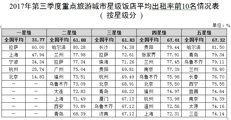 2017年第三季度全國星級飯店平均出租率為60.58%
