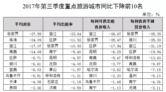 平均出租率:增幅位居前10位的城市為珠海、杭州、???、三亞、西安、西寧、武漢、太原、天津、南昌,其中珠海增幅最大,為31.03%;降幅位居前10位的城市為麗江、拉薩、張家界、南寧、昆明、沈陽、黃山、呼和浩特、石家莊、濟(jì)南,其中麗江降幅最大,為23.64%。