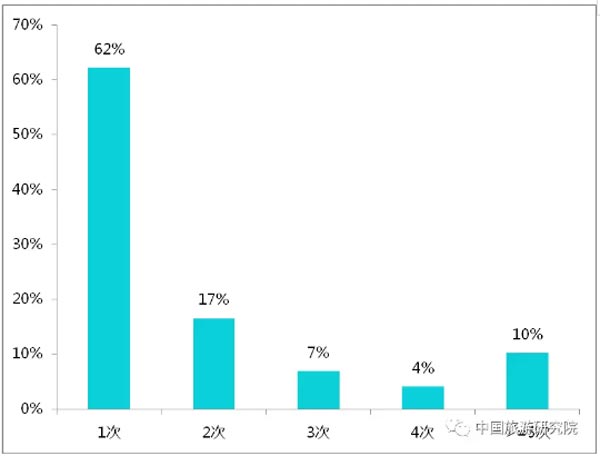 在對2017年赴歐洲旅游游客的出行頻次分析中可以看出,62%的游客在2017年出行歐洲1次,17%游客出行歐洲2次,高頻出游游客占比較少,降幅較大。中國赴歐洲飛行時間較長,旅游花費較高,低頻次旅游占比較大。