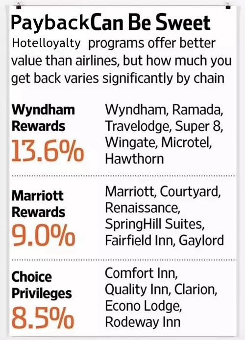Scott McCartney比較后認(rèn)為,溫德姆酒店集團(tuán)(Wyndham Hotel Group)的忠誠(chéng)獎(jiǎng)賞計(jì)劃是目前表現(xiàn)最好的。溫德姆酒店集團(tuán)擁有超過(guò)7800家經(jīng)濟(jì)型酒店、四星中檔酒店、海灘度假村和五星級(jí)豪華酒店,品牌有華美達(dá)、戴斯、速8等。