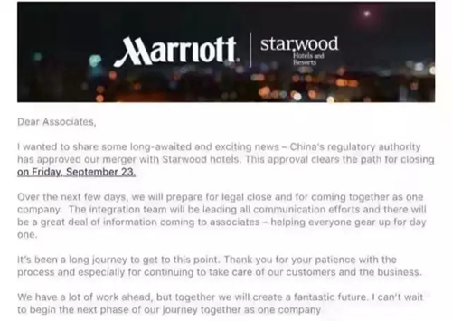 2016年9月20日,萬豪國際發(fā)表聲明稱,中國商務(wù)部已經(jīng)批準(zhǔn)其收購喜達(dá)屋酒店及度假村國際集團的交易。
