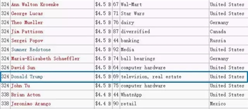 ▼ 2016年《福布斯》全球億萬富豪排行榜中特朗普以45億美元家產(chǎn)排名324位