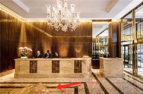 最直接的感受就是你一進(jìn)大堂的炫光金燦燦和 Trump logo。