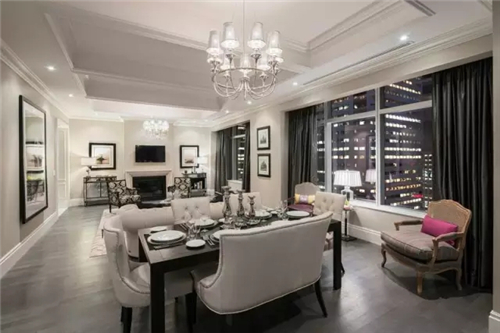 透過酒店頂層復(fù)式套房的落地玻璃,紐約夜景一覽無遺。