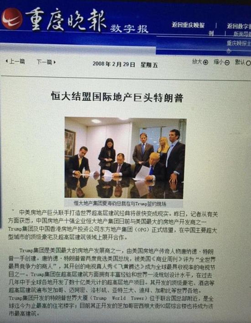 在特朗普勝出總統(tǒng)大選之后,8年前的一則新聞簡訊在特朗普勝選美國總統(tǒng)之后,再度刷爆朋友圈。這則簡訊的主要內(nèi)容是:2008年2月,中國房地產(chǎn)十強企業(yè)恒大地產(chǎn)集團與美國最大的地產(chǎn)開發(fā)商之一特朗普集團及中國香港房地產(chǎn)投資公司東方地產(chǎn)集團(OPG)正式結(jié)盟,在中國主要超大型城市的頂級豪宅及超高建筑領(lǐng)域展開合作。