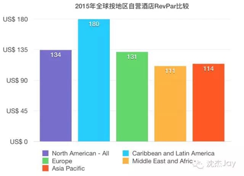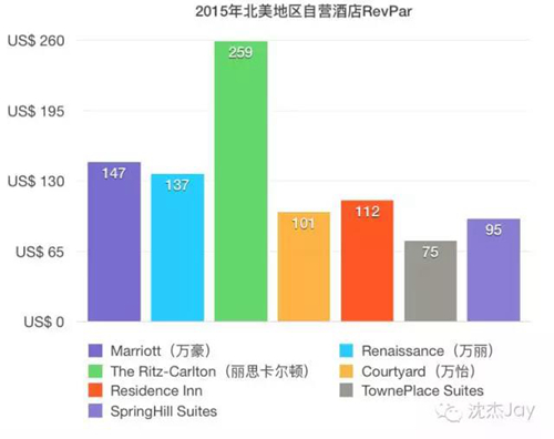 2015年各品牌的RevPAR均較前一年有提升,從品牌上來看,北美地區(qū)麗思卡爾頓的RevPAR達到了259美元,遠遠高于其他品牌。