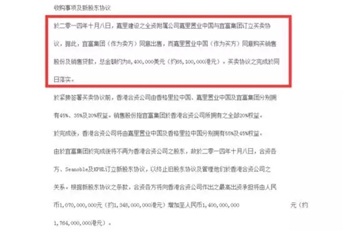 2014年10月8日,宜富集團(tuán)退出昆明香格里拉大酒店項(xiàng)目,嘉里建設(shè)發(fā)布公告,公告顯示嘉里建設(shè)全資附屬公司嘉里置業(yè)(中國(guó))有限公司與宜富集團(tuán)簽訂買(mǎi)賣協(xié)議,以總額約840萬(wàn)美元(約6510萬(wàn)港元)收購(gòu)宜富集團(tuán)持有香格里拉國(guó)際飯店(昆明)有限公司的20%股權(quán)。交易完成后,香格里拉國(guó)際飯店(昆明)有限公司將僅由嘉里置業(yè)(中國(guó))及香格里拉中國(guó)兩家控股,其中,嘉里置業(yè)占股從35%增加至55%,成為香格里拉國(guó)際飯店(昆明)有限公司最大的股東。