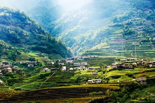 路上,耶律往窗外亂看,突然一個(gè)村子闖進(jìn)視野。層巒腳下,梯田之上,幾間白色平房,錯(cuò)落拼湊出一個(gè)小村子的模樣,滿(mǎn)眼都是深深淺淺的綠色和霧氣蒸騰。