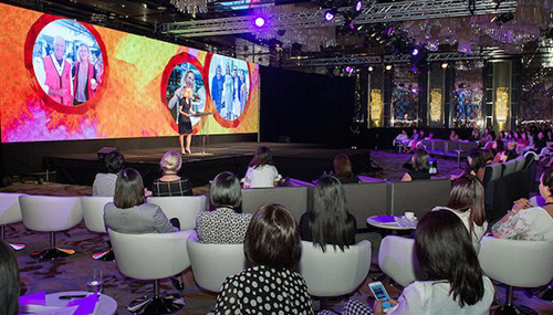 在麗思卡爾頓酒店的鉆石廳里,座位呈扇形擺放,一塊比演講臺還寬的顯示屏是主要光源之一。這塊屏幕很大,大到會讓投射上去的明艷色彩顯得更加張揚,讓鼓舞人心的短句顯得更讓人信服。Beyoncé的歌聲有力地循環(huán)著,“Who run the world?Girls.” (誰掌管這個世界?女生們。)這一切讓人情緒高漲。