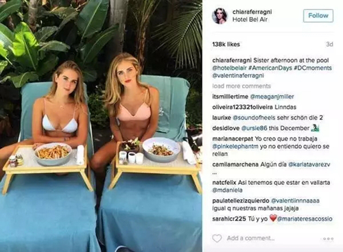 全球最火的時尚博主Chiara Ferragni拉著做設計的妹妹一起,兩個人輪流在Instagram發(fā)同一張照片,定位都是Hotel Bel Air。真是名副其實的“網紅”酒店。