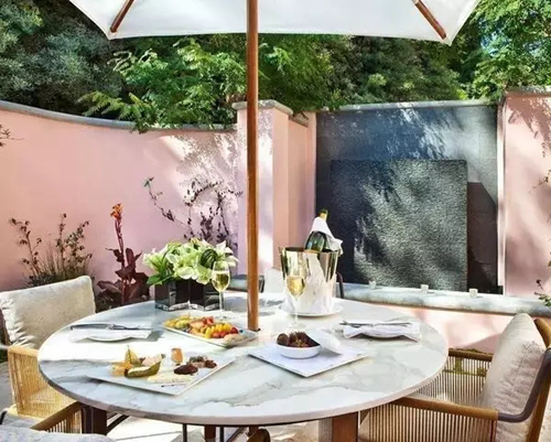 整個酒店的主色調就是去年潘通公司評出來的年度色——玫瑰石英粉,更多了點布達佩斯大飯店的味道,離比弗利山莊也不遠,總之一切都很夢幻……