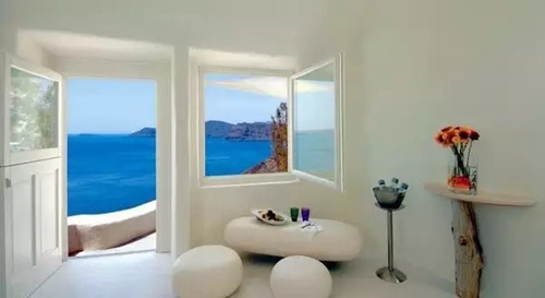 所有套房都有面朝大海的露臺,可以盡情欣賞湛藍的地中海、全景火山、和圣托里尼獨有的峭壁上的純白建筑。