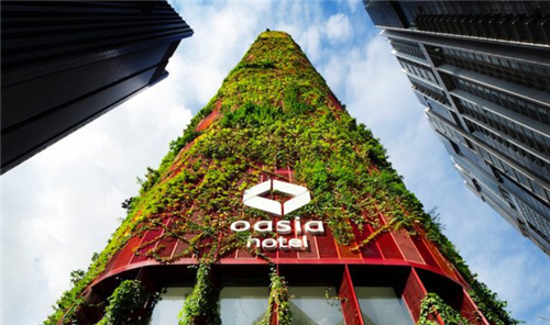 Oasia 酒店被認(rèn)為是熱帶地區(qū)城市土地集約利用的一個典型案例,它的整體綠地率達(dá)到了 1100%。在林立的鋼筋水泥高樓群中,這個酒店看起來格外突兀——它的表面長滿了綠植,給人眼前一亮的感覺。
