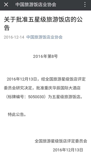 2016年12月13日,全國旅游星級飯店評定委員會發(fā)布公告,經(jīng)研究決定,批準(zhǔn)重慶華辰國際大酒店(標(biāo)牌編號:5050030)為五星級旅游飯店。