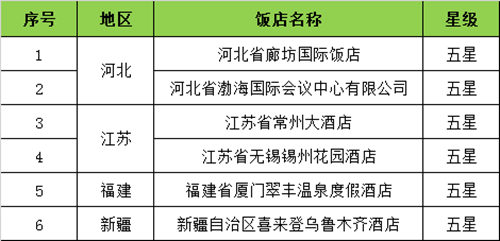新聞來源:宏輝智通 發(fā)布日期:2016-12-15 瀏覽次數(shù):3235河北省廊坊國際飯店、河北省渤海國際會議中心有限公司、江蘇省常州大酒店、江蘇省無錫錫州花園酒店等六家飯店的五星級旅游飯店資格。