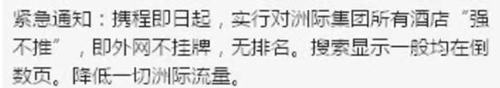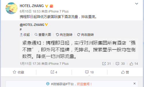 早在今年1月11日,“HOTEL-ZHANG”也發(fā)布微博曝光過攜程類似行為,“緊急通知:攜程即日起,實行對洲際集團所有酒店強不推,即外網(wǎng)不掛牌,無排名。搜索顯示一般均在倒數(shù)頁。降低一切洲際流量。”