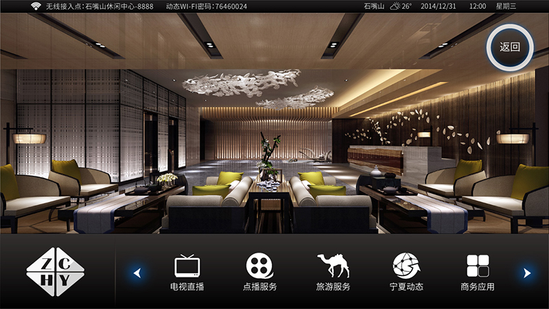 石嘴山酒店 新聞來源:宏輝智通 發(fā)布日期:2016-01-04 瀏覽次數(shù):16332 1.石嘴山酒店終端歡迎界面: 2.石嘴山酒店終端主界面: 上一篇:唐山金鼎大酒店 下一篇:星宇國際大酒店