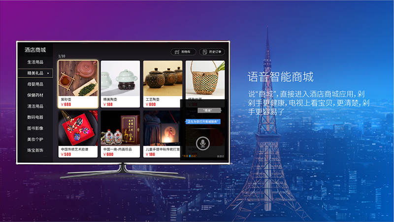 說“商城”,直接進入酒店商城應用,剁剁手更健康,電視上看寶貝,更清楚,剁手更容易了。