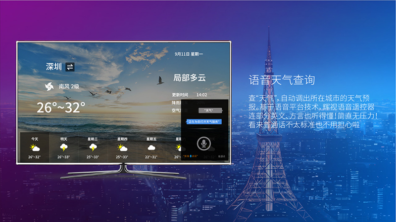 查“天氣”,自動調(diào)出所在城市的天氣預報?;谡Z音平臺技術,輝視語音遙控器連部分英文、方言也聽得懂!簡直無壓力!看來普通話不太標準也不用擔心啦