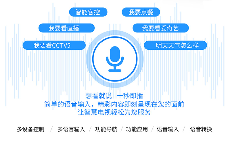 語音控制是電視智能化的標志之一,它具有語音控制換臺、關機、語音搜索影視、音樂資源等功能。不用遙控器、不用換電池,你說它聽,你說它做。區(qū)別于傳統(tǒng)遙控器的按鍵操作、拼音搜索,用戶只需語音對話,即可方便快捷地實現(xiàn)直播切換、點播搜索、應用調(diào)取及百科查詢等功能,極大提升了iTV用戶操作中的靈活性與便捷性。不會說普通話?不用擔心 ,輝視語音遙控在語音識別引擎上,做了多語種識別。方言那又怎么樣?智能語音遙控器照樣說到做到。