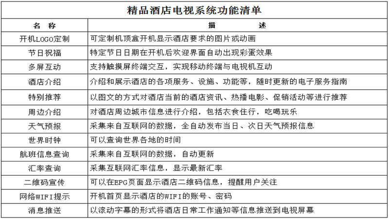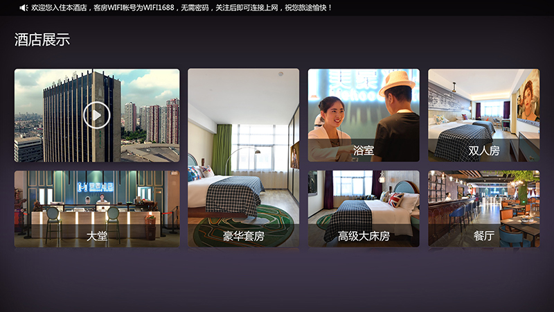餐飲服務(wù):以文字、視頻、圖片、幻燈片等方式,介紹酒店餐飲、酒水、預(yù)購(gòu)電話提示,也可和酒店PMS對(duì)接 實(shí)現(xiàn)下單功能,需收費(fèi)實(shí)現(xiàn)